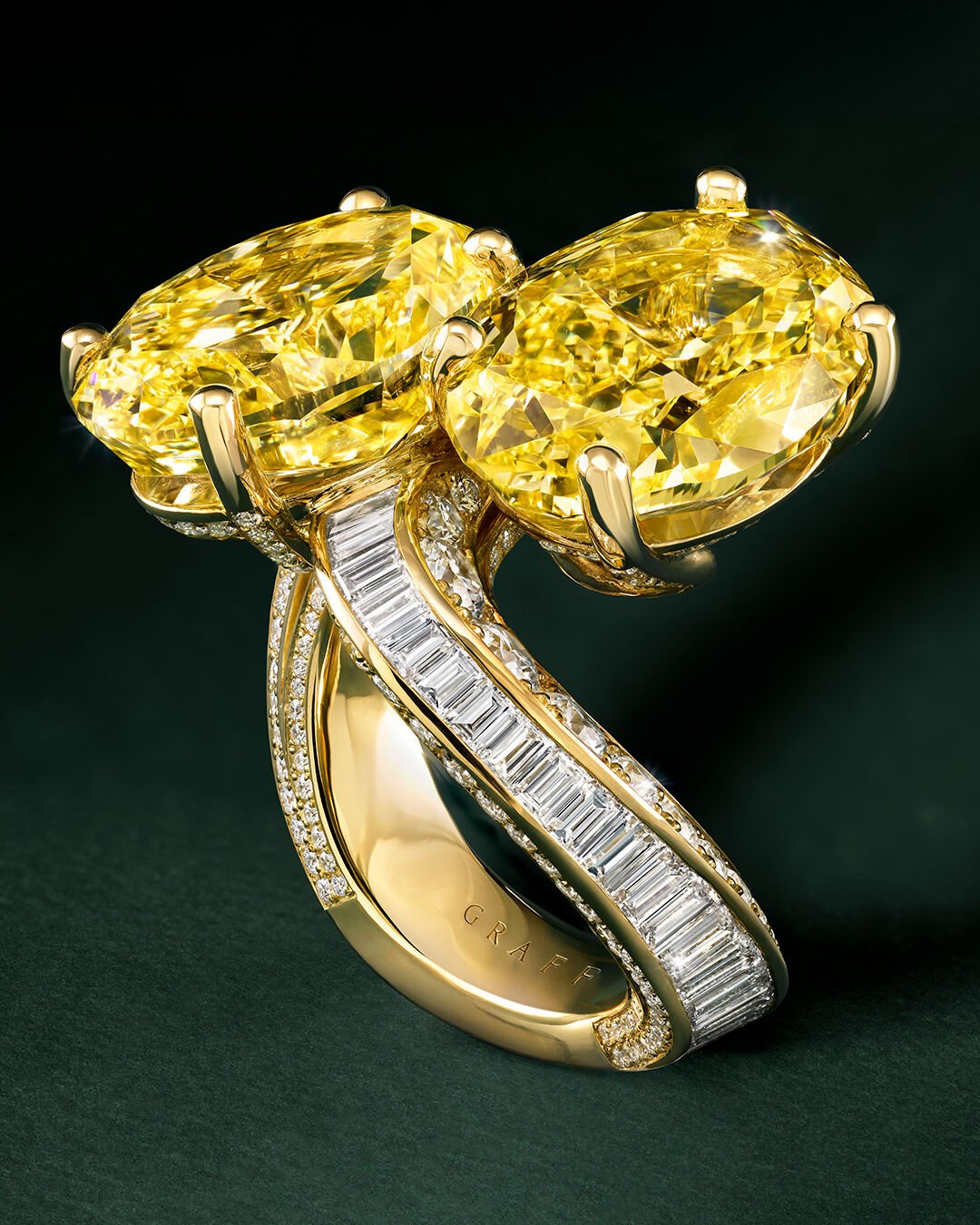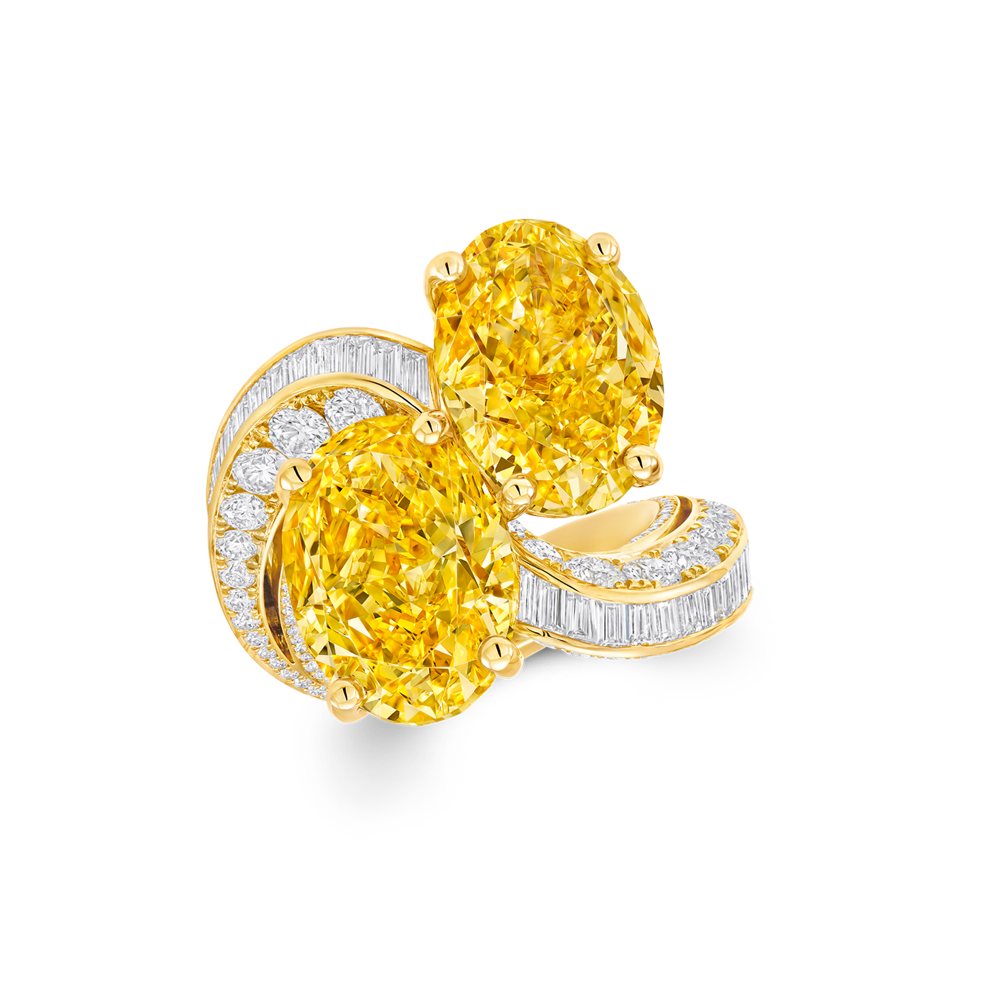 Handcrafted in yellow gold by skilled master artisans and set with two 8 carat oval Fancy Vivid Yellow diamonds, a spiralling line of intertwined custom-cut baguette cut white diamonds and pavé yellow diamonds encircle the finger.
