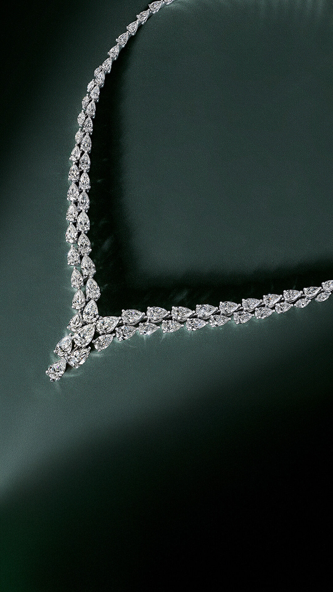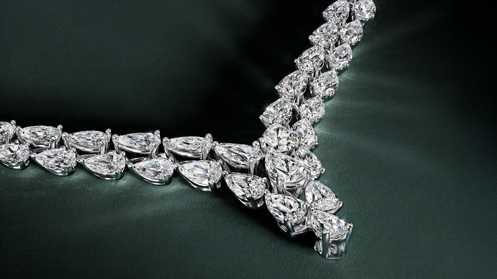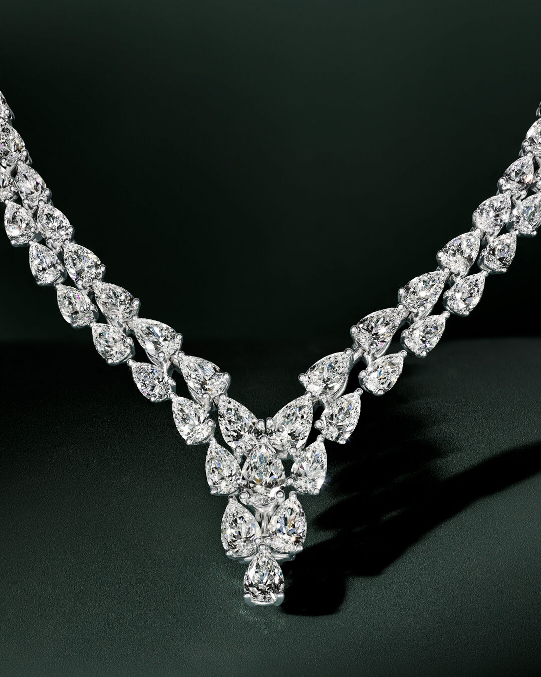 Crafted in a classic V-shape, double rows of pear shape diamonds cascade downwards towards the central motif – a cluster of further pear shape stones. The precise cut and placement of each diamond creates a dramatic sense of movement.