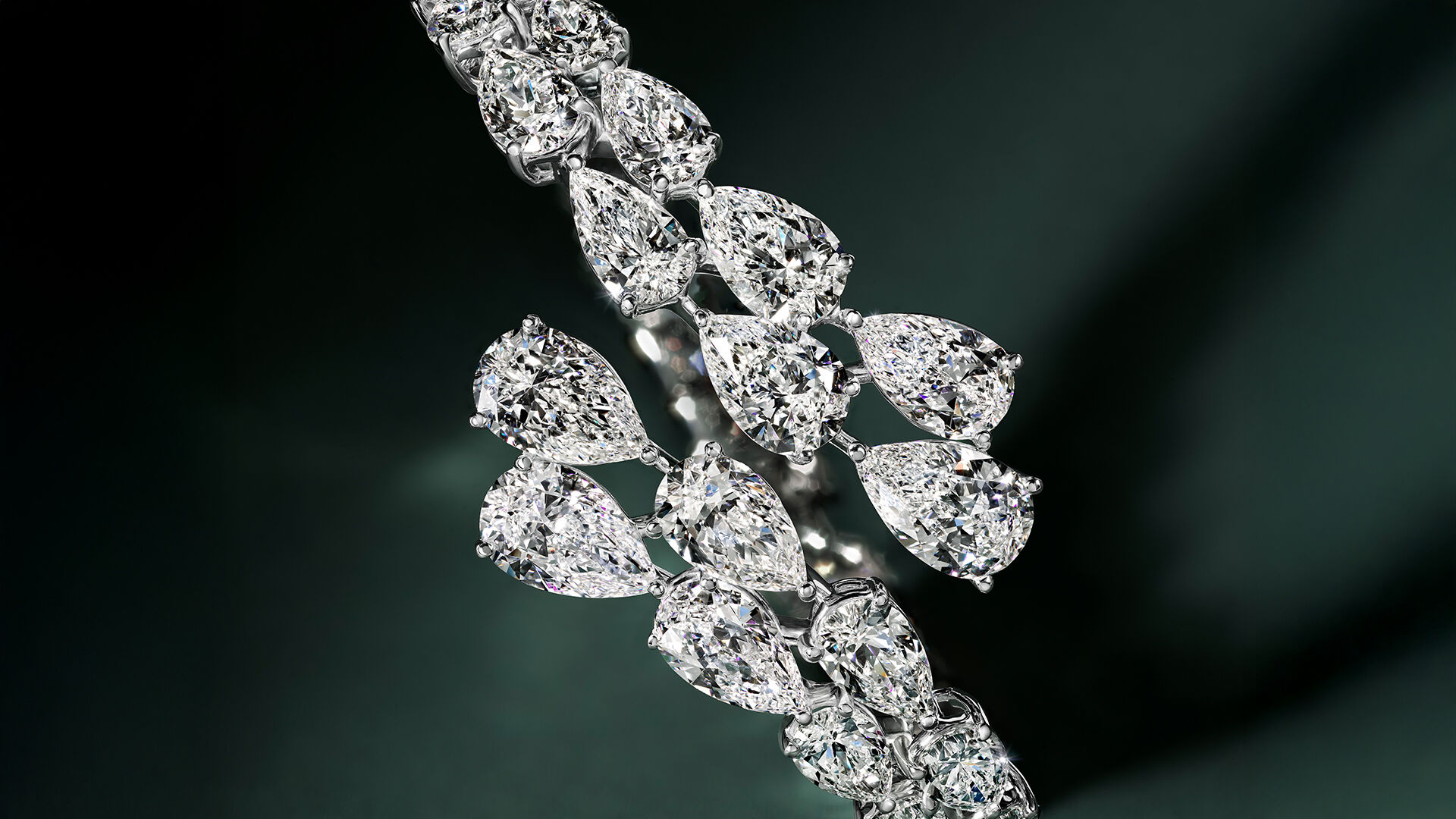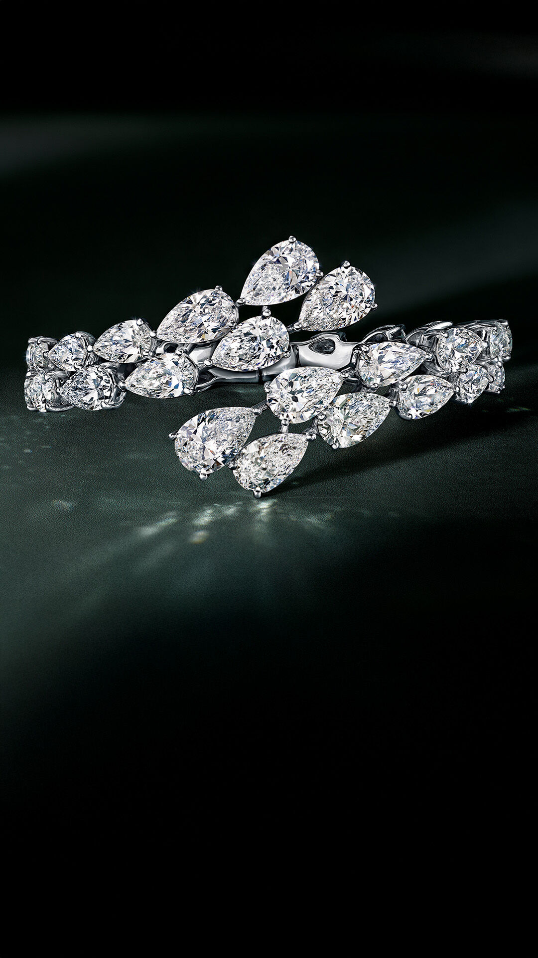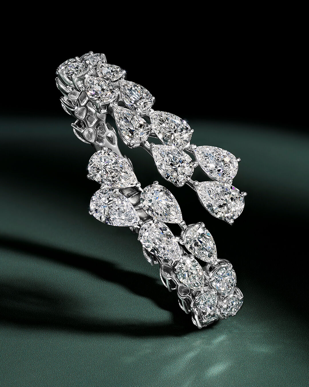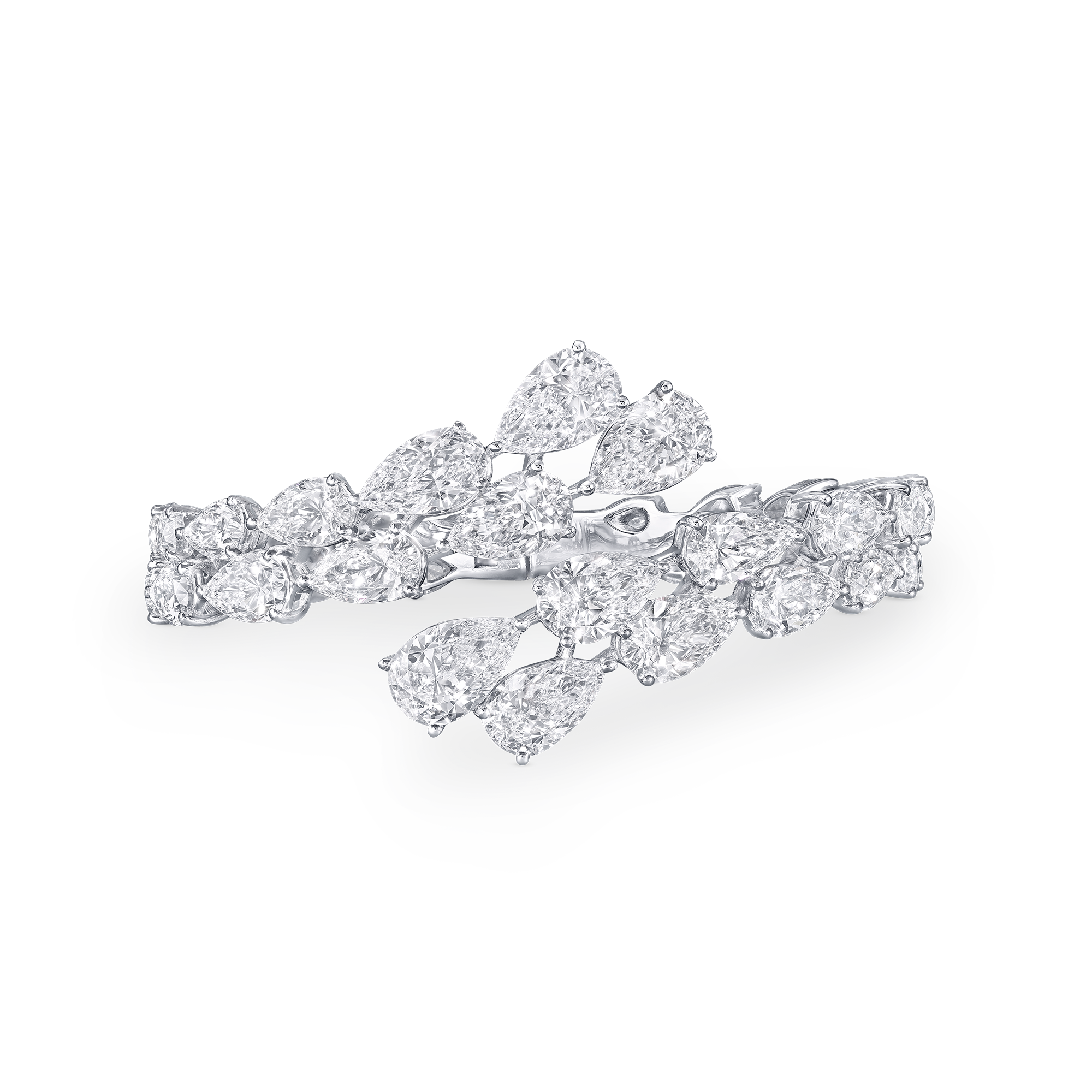 • Exquisitely aligned rows of pear shape diamonds encircle the wrist, creating a seamless cascade of light. A timeless, highly sculptural bangle, the design allows the natural beauty of each diamond to shine.