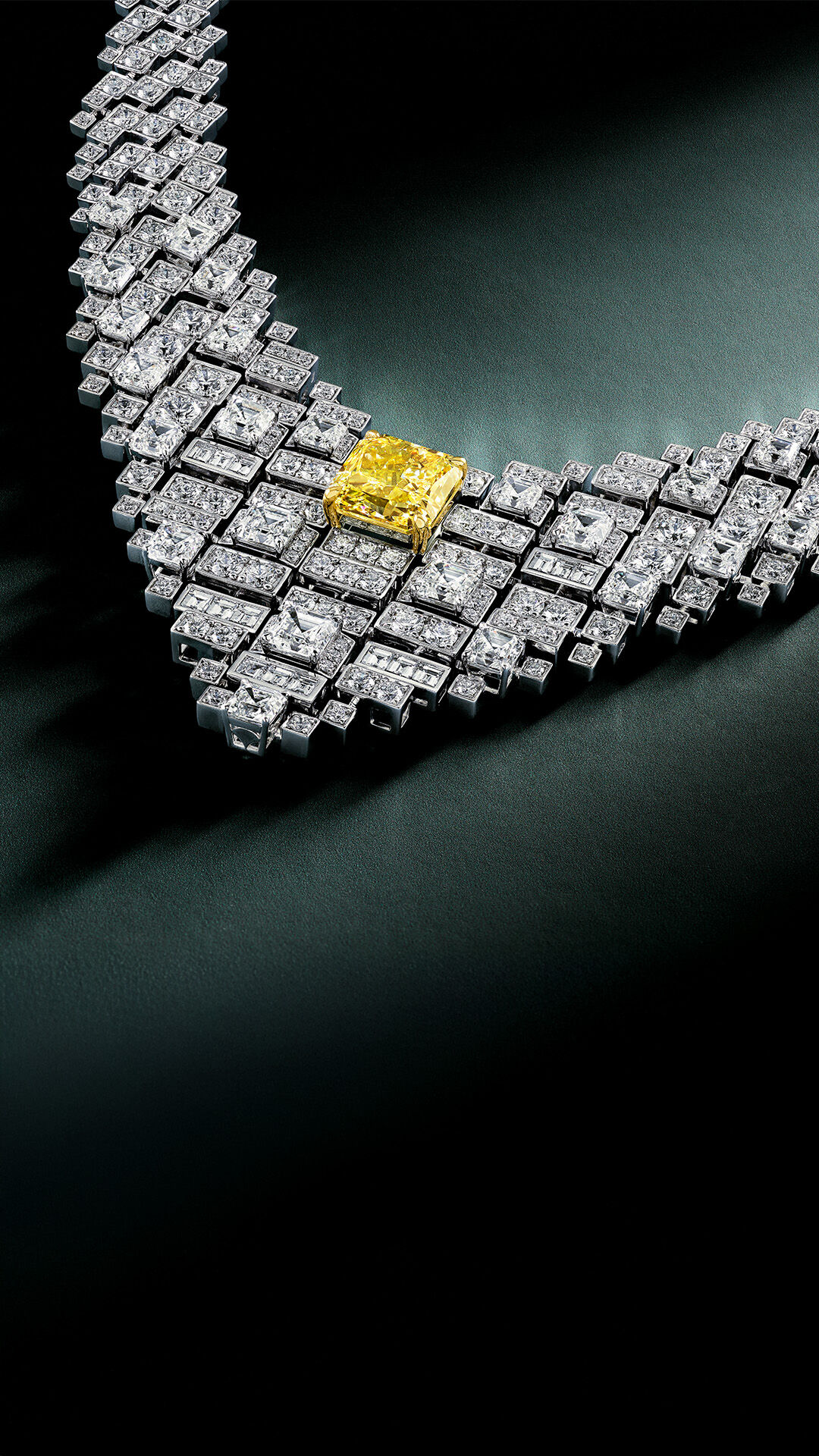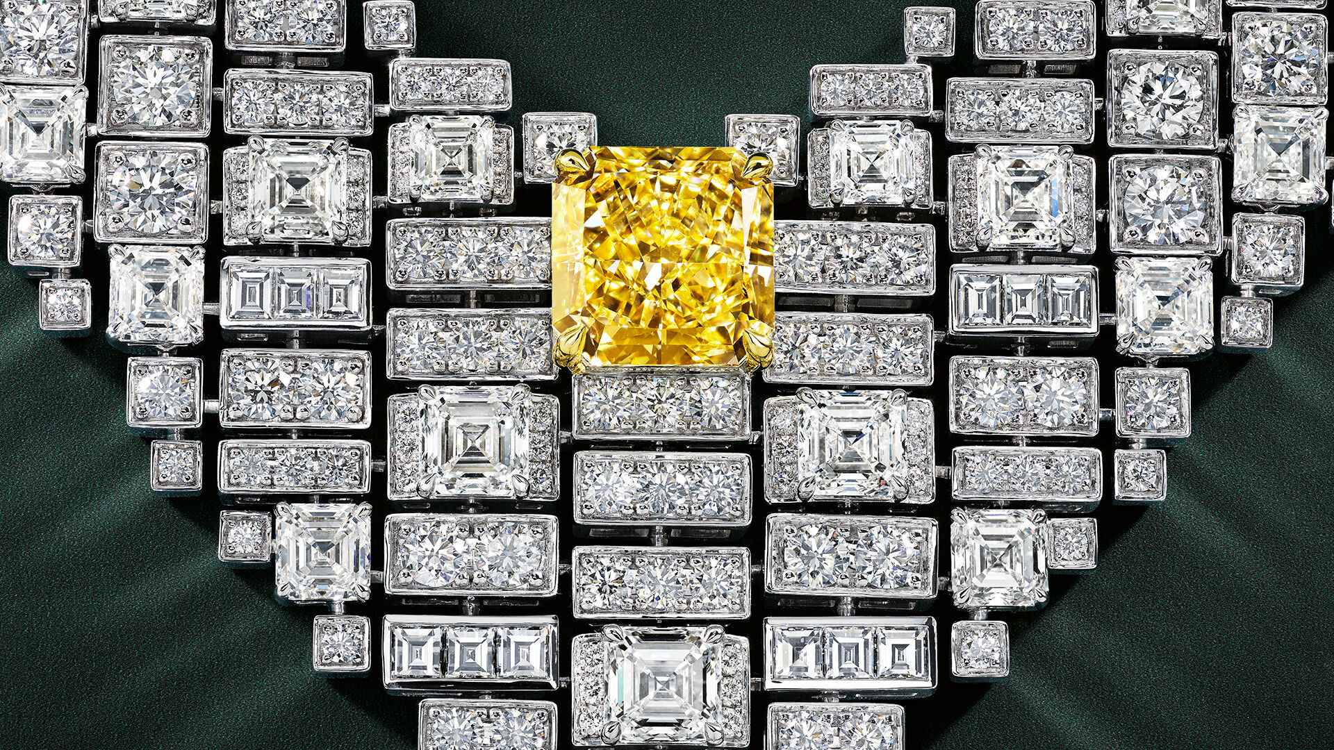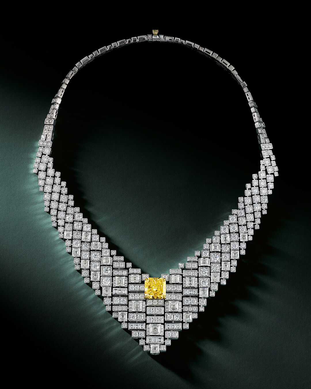 Crafted in white gold, the design tapers into a striking V-shape composed of 455 white diamonds. The piece is centred by a single, magnificent 10.01 carat radiant cut Fancy Intense Yellow diamond that appears to float effortlessly, radiating a commanding brilliance.