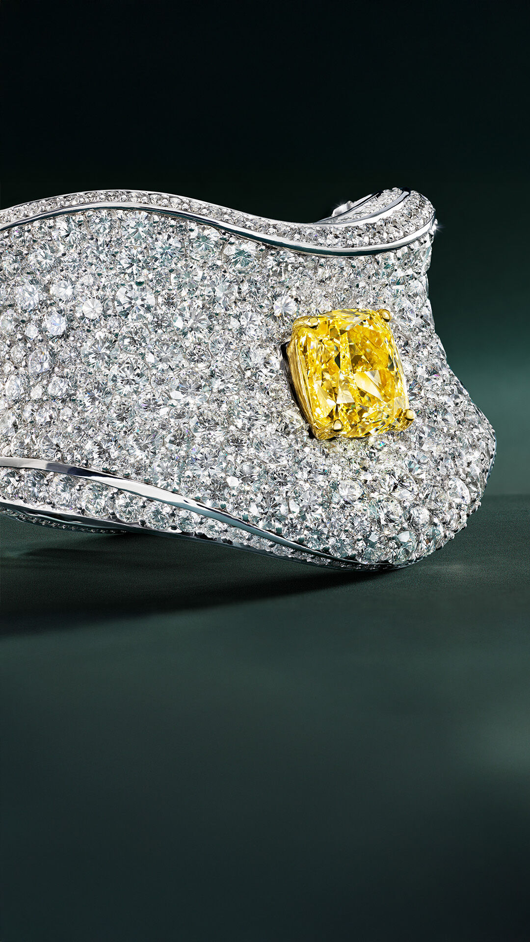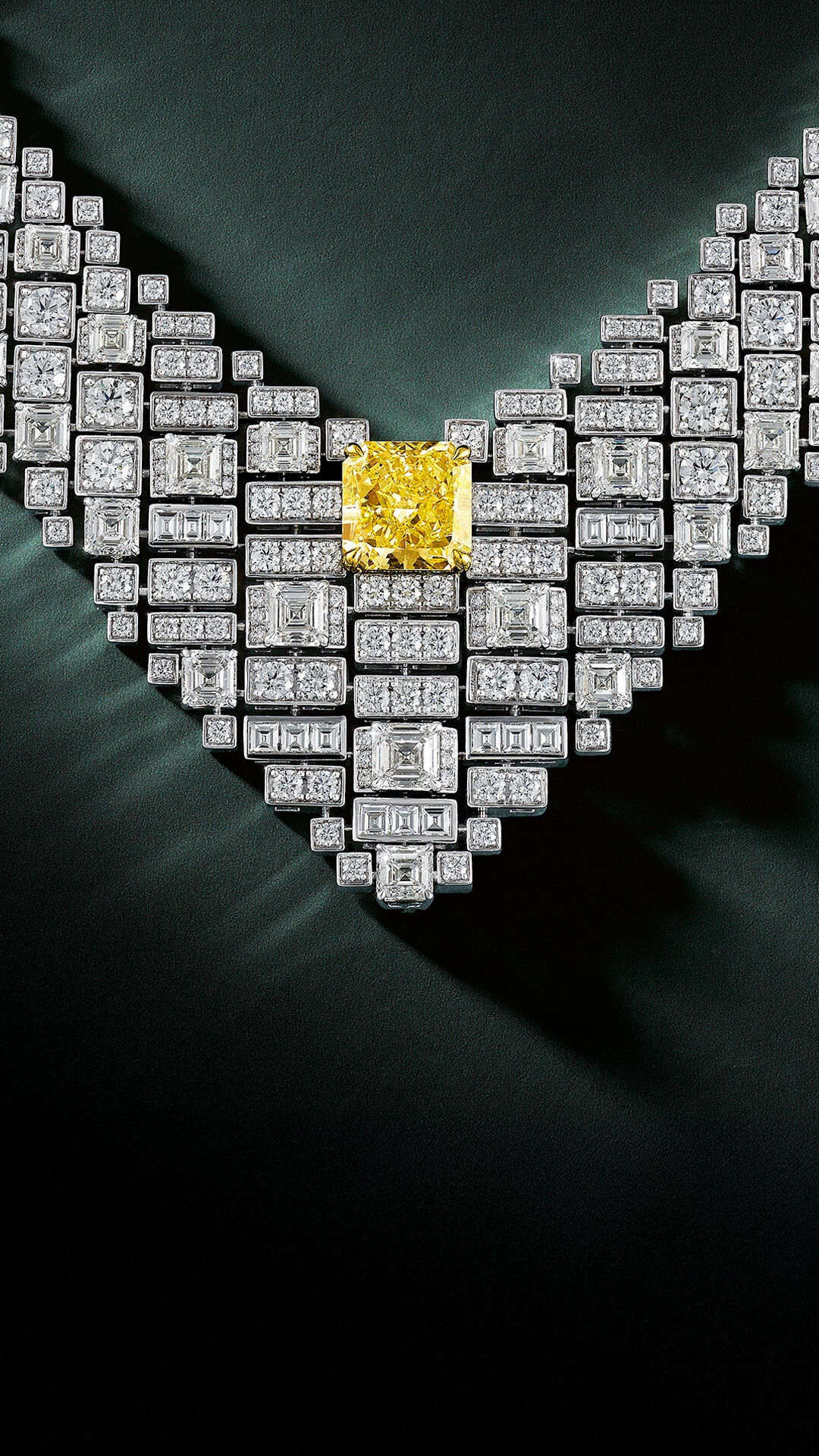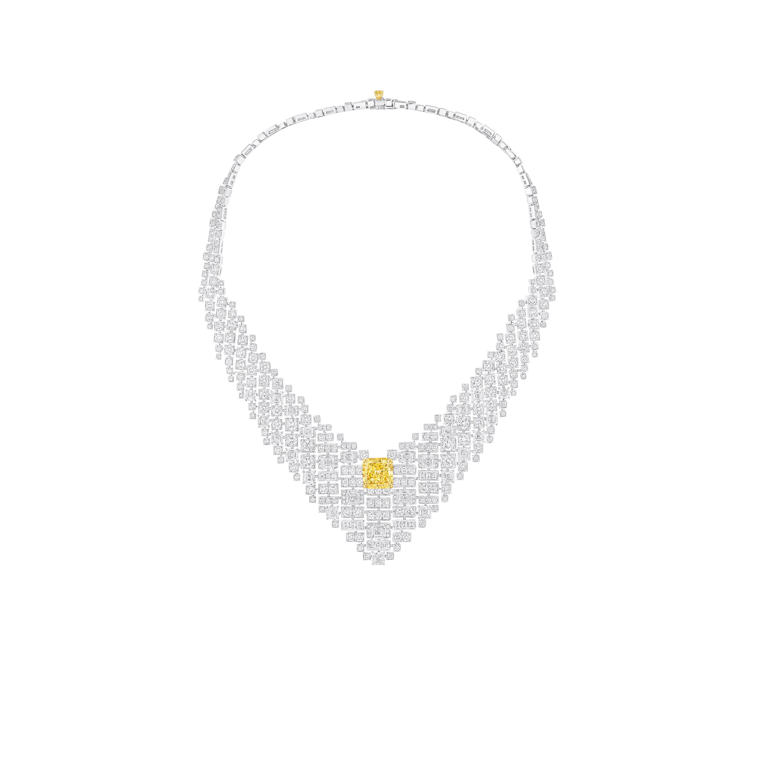 Crafted in white gold, the design tapers into a striking V-shape composed of 455 white diamonds. The piece is centred by a single, magnificent 10.01 carat radiant cut Fancy Intense Yellow diamond that appears to float effortlessly, radiating a commanding brilliance.