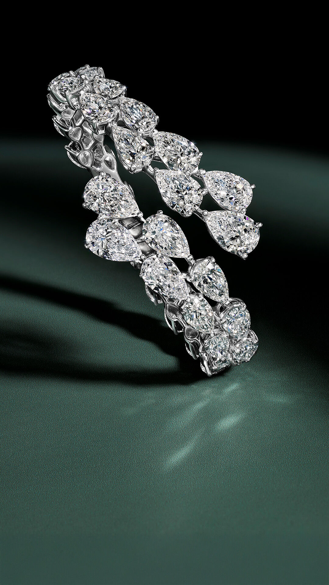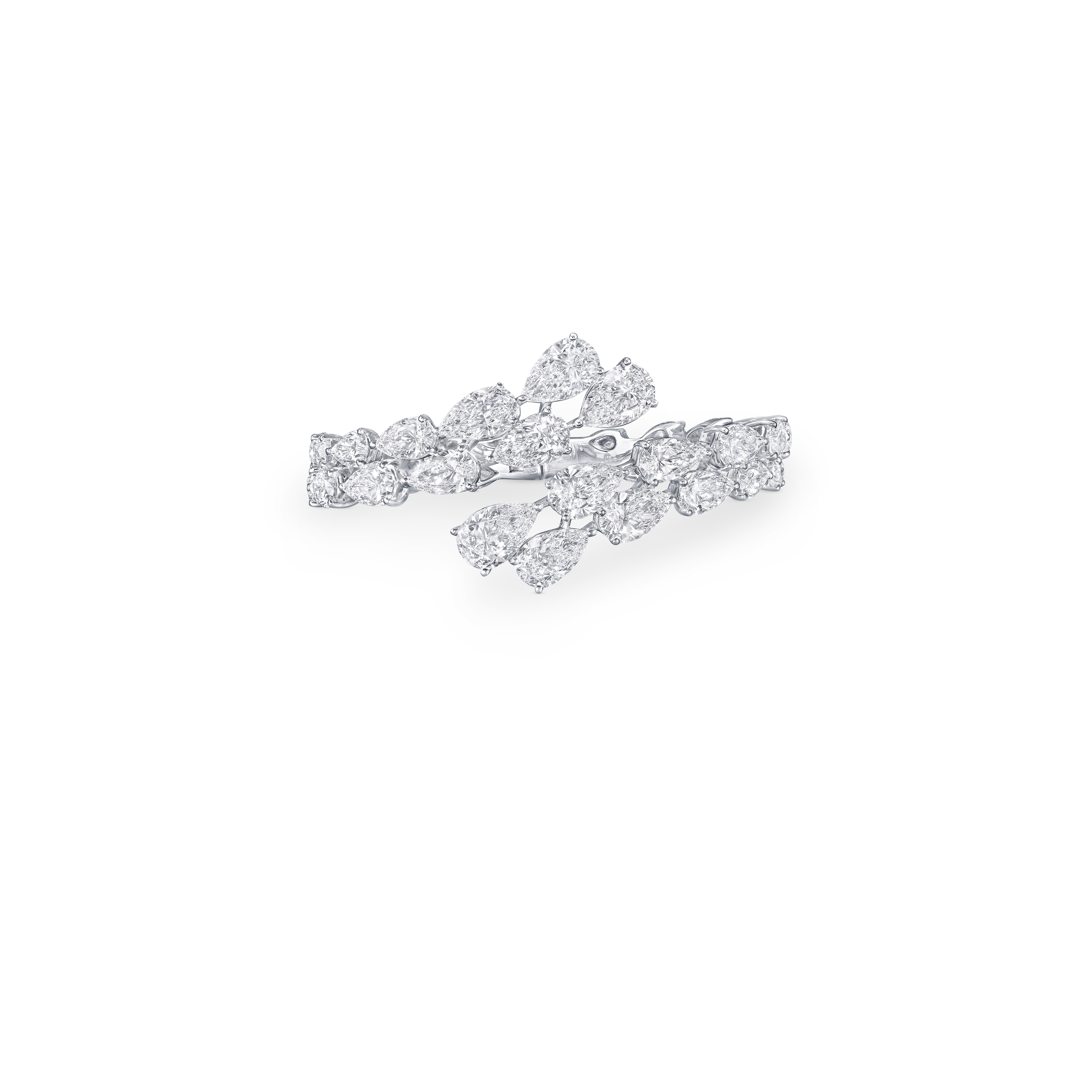 Set with 13 pear shape diamonds, this bangle has a total weight of 35.17 carats. Each stone was carefully selected for its exceptional lustre and then meticulously graduated to enhance the rhythm of light across the piece, creating a radiant display of brilliance.