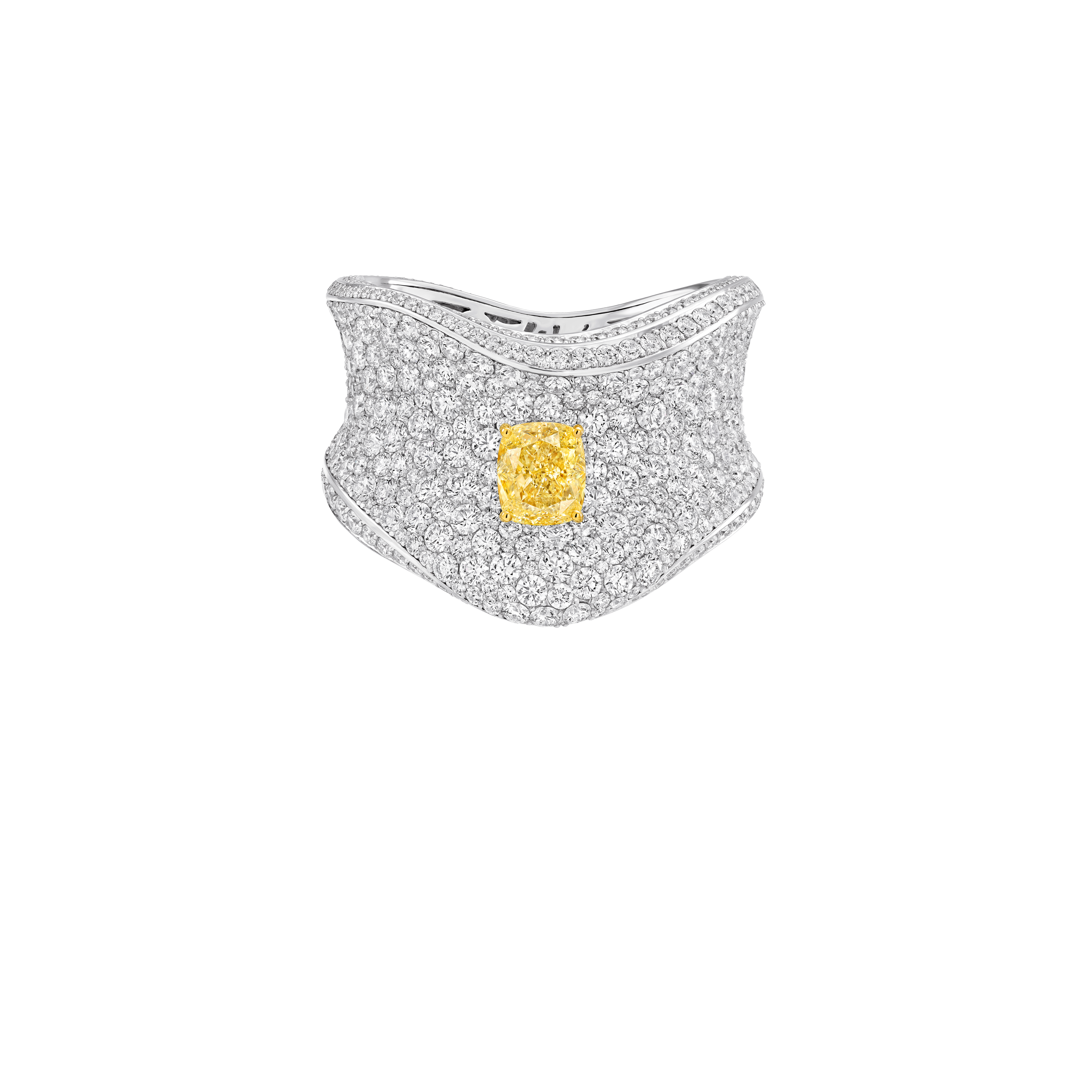 This ornate creation is centred around an exhilarating 18.29 carat cushion cut Fancy Intense Yellow diamond, which is suspended above a lustrous surface of snow-set pavé diamonds totalling 107.50 carats. Featuring a sculpted, gently undulating design, a voluminous curve of further snow-set pavé diamonds outlines both the upper and lower edges of the piece.