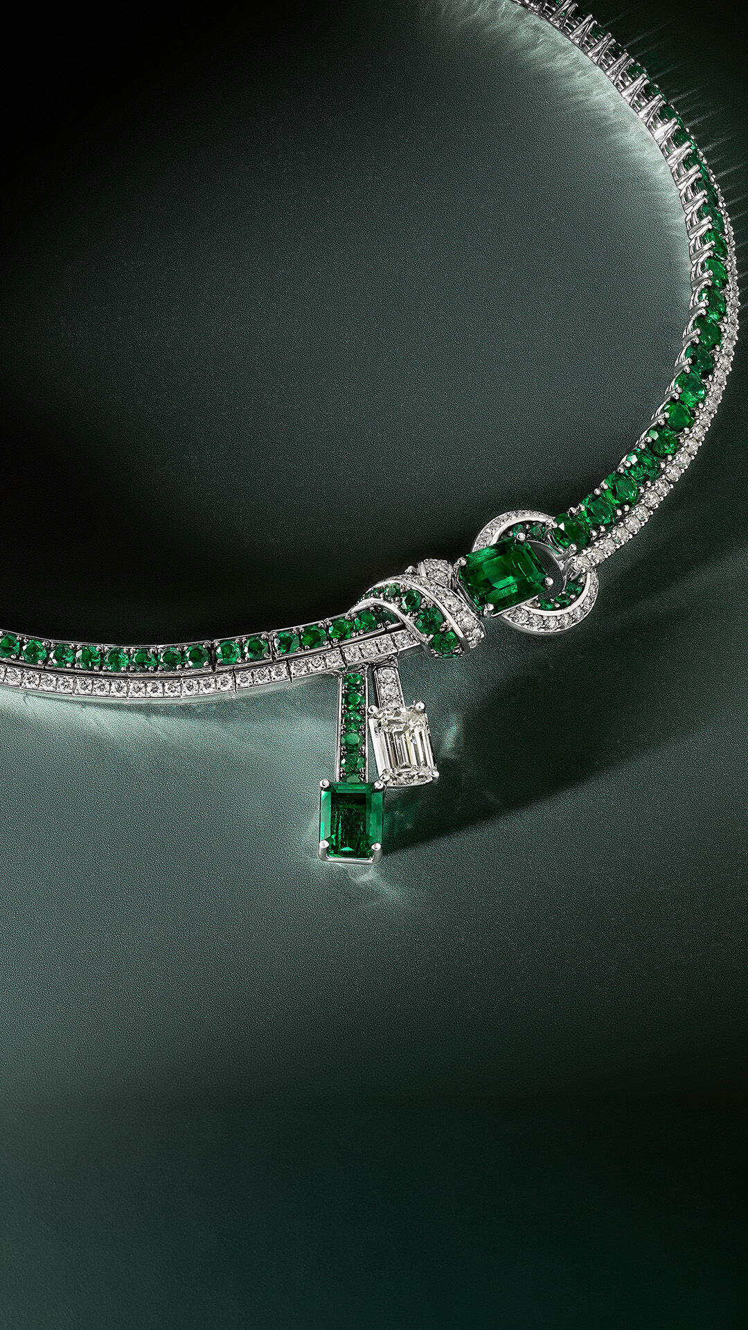 Set within a white gold framework, this necklace features a hypnotic trio of significant stones: a 3.22 carat emerald cut emerald, a 2.51 carat emerald cut emerald and a 3.02 carat emerald cut diamond, which captivate the gaze and conjure a dazzling centrepiece.