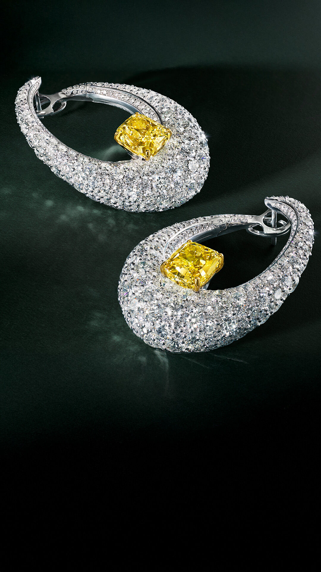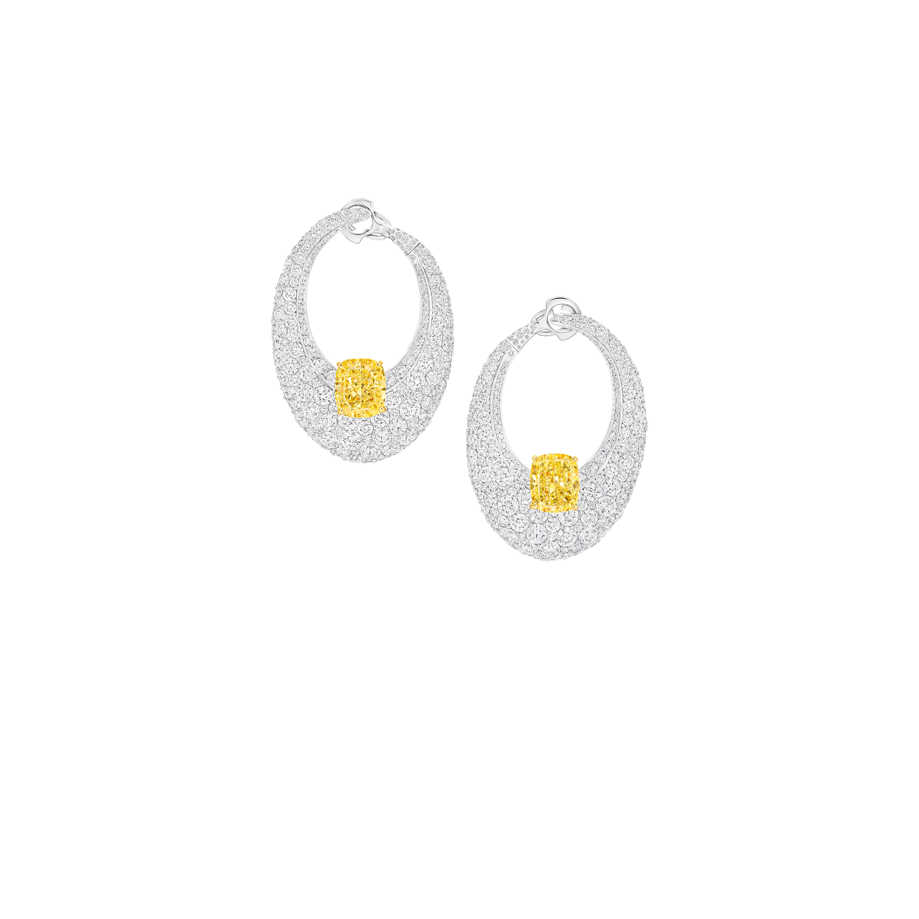 A lustrous arrangement of round brilliant and pavé stones are set into a soft oval shape, accentuated by single 7 carat cushion cut Fancy Intense Yellow diamonds. Using a complex snow-setting technique, 500 white diamonds of varying sizes were meticulously positioned by Graff’s artisans to create a flawless surface of scintillation.
