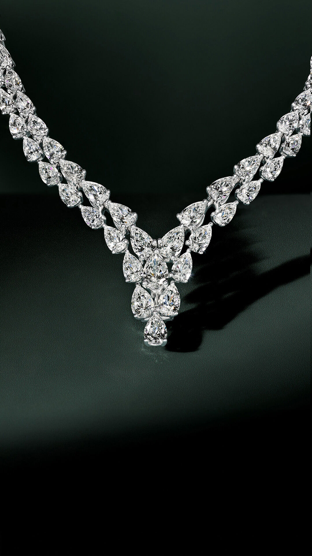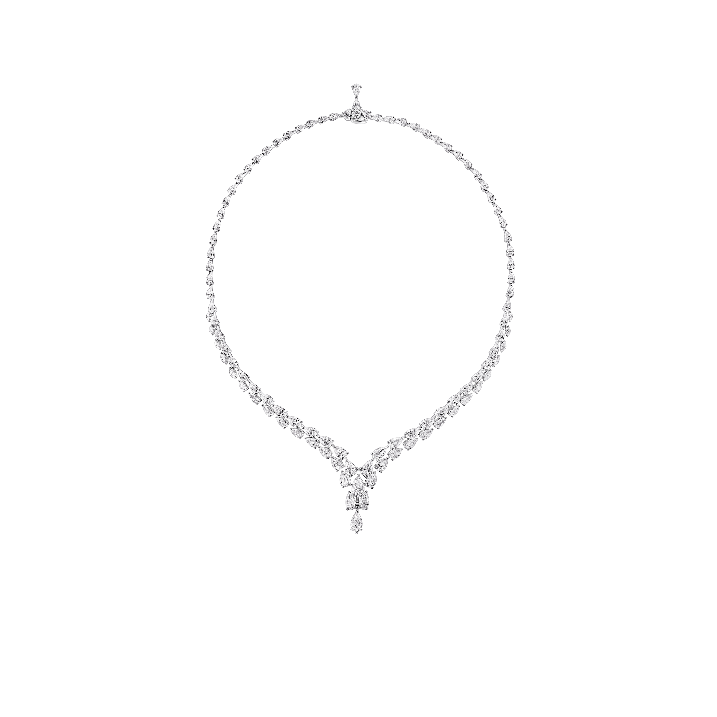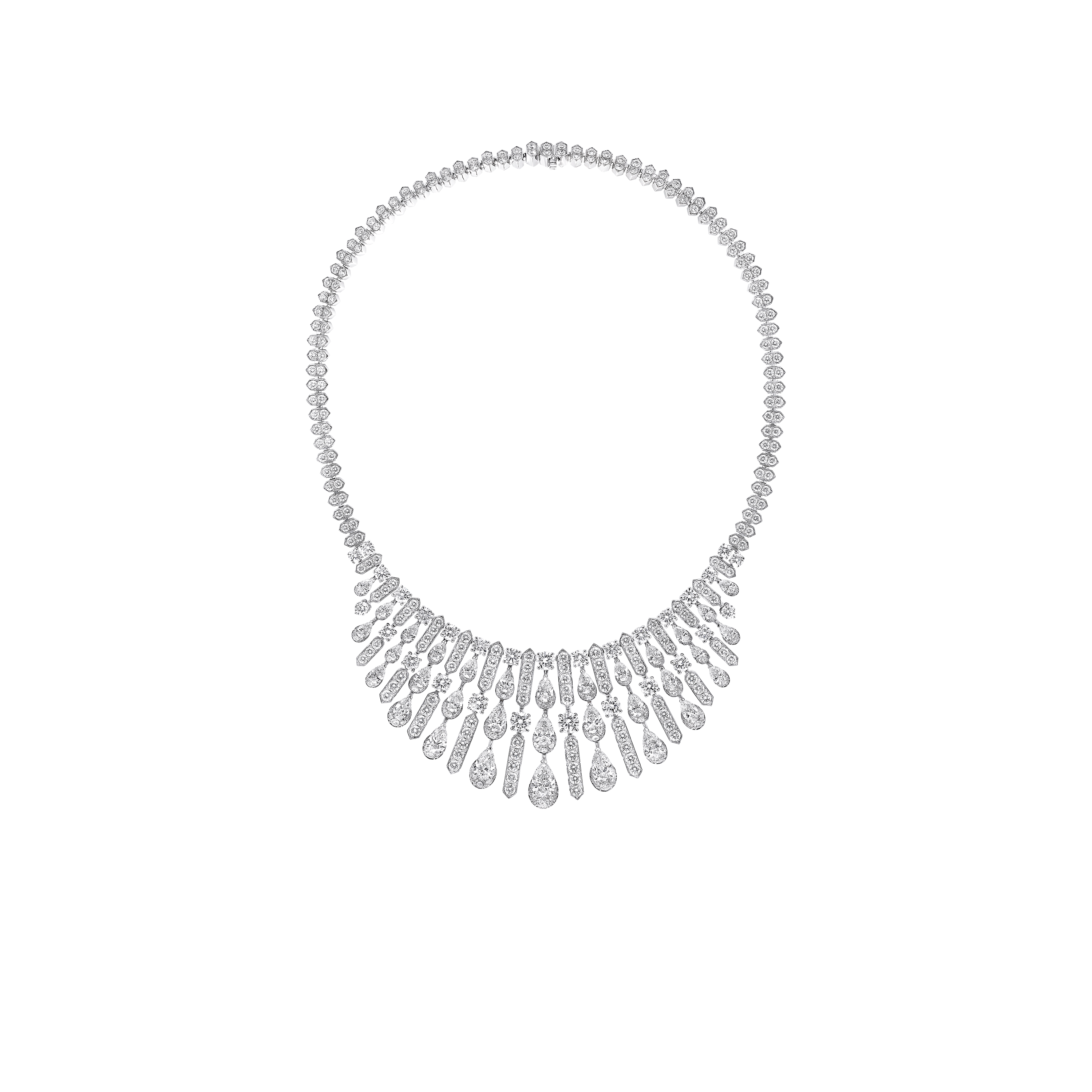 Composed of 487 pear shape and round diamonds, with a total weight of 43.78 carats, this piece explores a graceful interplay of light and form. Crafted in white gold, pear shape diamonds cascade from round brilliant stones, alternating with bold, angular lines of round pavé and round brilliant diamonds.